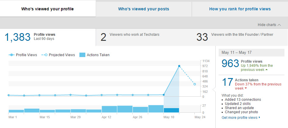 - After a few days, go back into your LinkedIn account and click on the section to view who's looked at your profile. You'll notice that there are a lot of people in this list now. That's because LinkedIn is now tracking everyone that visits your website (that's still logged into their LinkedIn account) as someone who's viewed your profile!